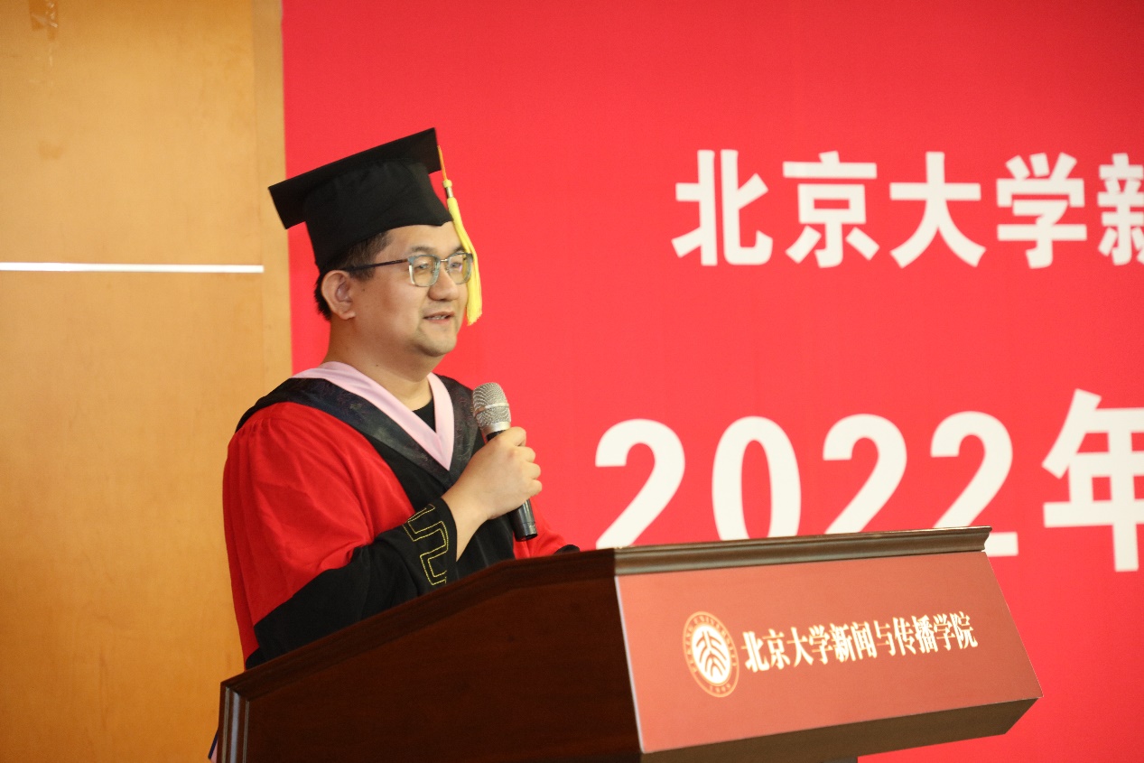 2020级硕士生班主任张慧瑜作为教师代表为毕业生送上祝福与勉励。他希望同学们能以长远的眼光和开阔的胸襟拥抱生命的波澜,踏踏实实做事、认认真真发声,勇于在不怕失败的尝试中谋新路,而不为一时一地的得失所困。无论何时何处,都不能丢了北大新传讲求尊重、提倡包容的本色,要守好乐于沟通的同理心,养好求同存异的宰相肚,始终把“将心比心、推己及人”刻在行稳向前的基石上。