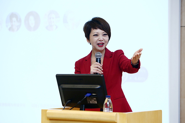 在同学们热烈的掌声中,身着一袭酒红色西装的田薇款款走上讲台。一开场,她就以近期的采访经历为例,介绍了“世界在快速变化”的现况,并由此引出她分享的核心——提问题(ask questions)。