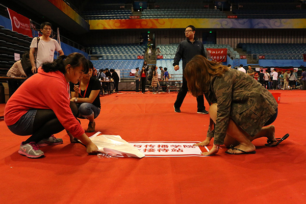 5日6时,燕园的夏雨还未停歇,整装待发的志愿者们便从学院启程,将迎新物资搬运到邱德拔体育馆,紧张有序地开始布置迎新接待站。由于不期而至的大雨,今年北大的迎新活动改在邱德拔体育馆内举行。在各院系一排排整齐的迎新站点之中,新传鲜明的旗帜尤为突出。接待站前的橙色箭头指向报到注册点,一旁侧立的报道流程图为新生及家长明确指示出办理报到手续的各项流程,而接待站的前方两块用来拍照的展板也早早被安置妥当,负责摄影的志愿者们在展板前架好相机,等待新生的到来。